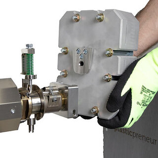 Eine Form kann direkt mit einem Schnellverschlusssystem an die Düse angeschlossen werden. Der geschmolzene Kunststoff wird dann direkt in die Form extrudiert.