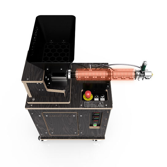 Zerkleinerte Kunststoffflocken werden in den Trichter gefüllt. Die motorbetriebene Extruderschnecke mit drei Heizzonen zieht die Flocken an und schiebt sie durch das Fass. Heizelemente erzeugen zusätzliche Wärme.